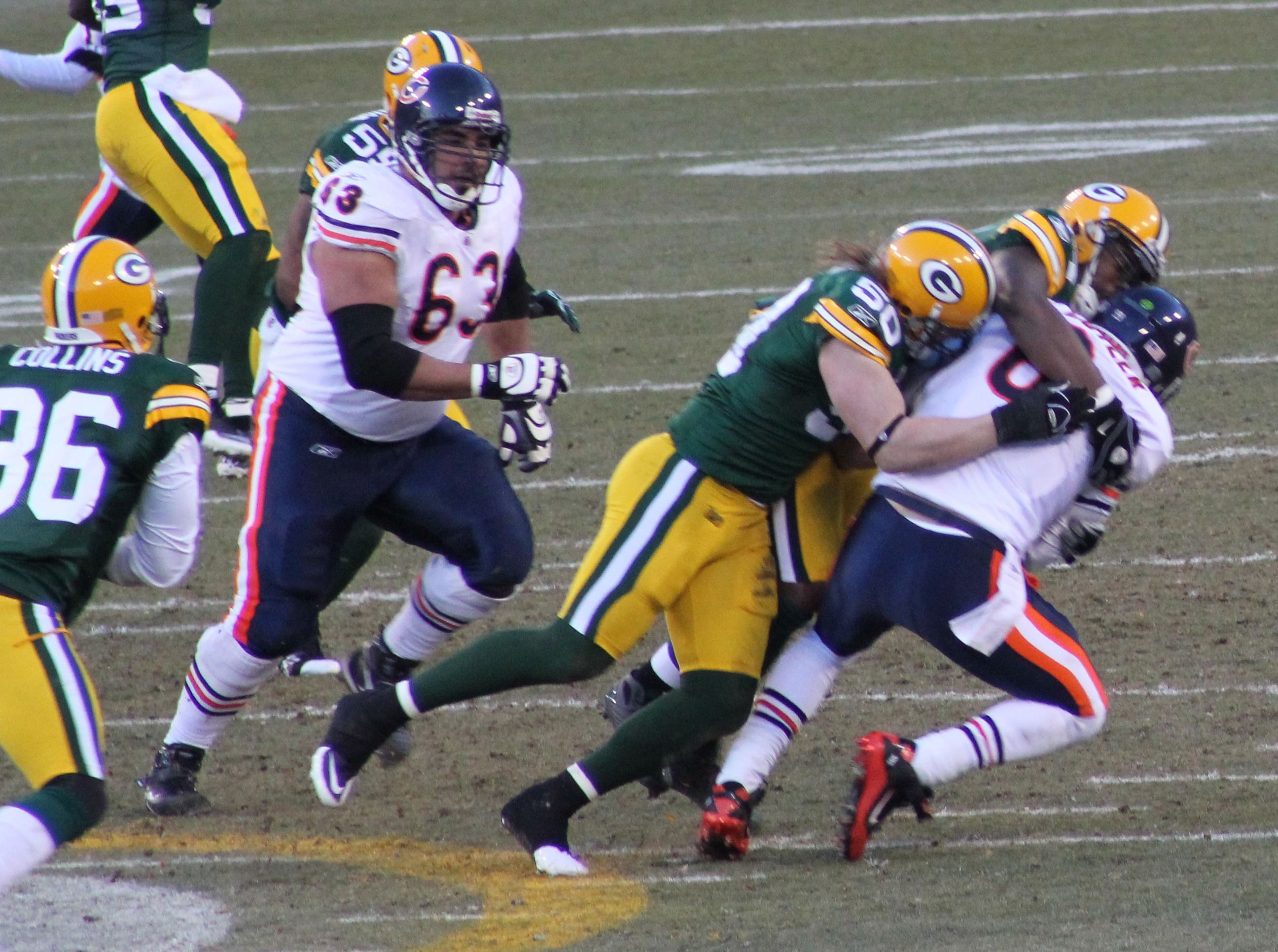 A few Packers bring Jay Cutler to the ground.